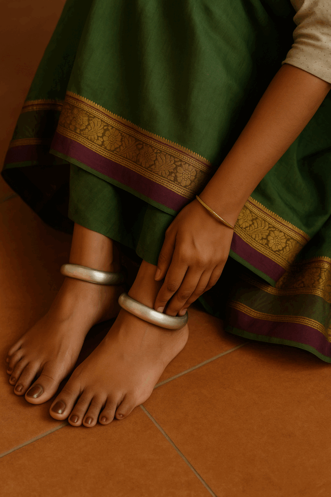 Growing up, many of us remember that sound — a soft chime as women swept the floors, drew kolams, or walked across the courtyard. It was a sound that filled homes with presence. Comforting. Familiar. Yet, somewhere along the way, as fashion evolved and life grew faster, these anklets were set aside — their purpose forgotten, their symbolism dismissed as superstition.